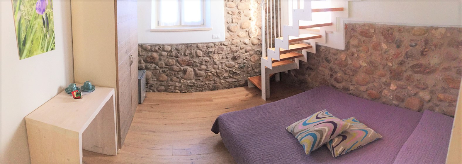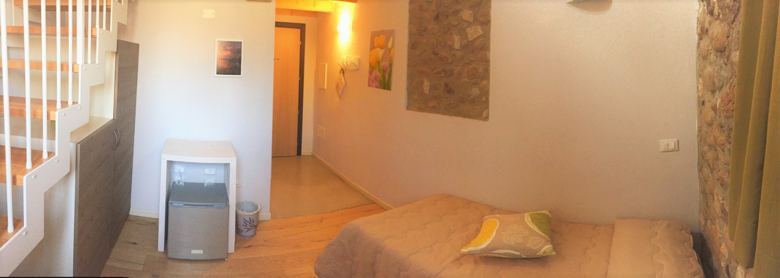 Piano primo con soppalco, matrimoniale e letto singolo, bagnodoccia, Tv sat, minibar, wifi, riscaldamento aria condizionata